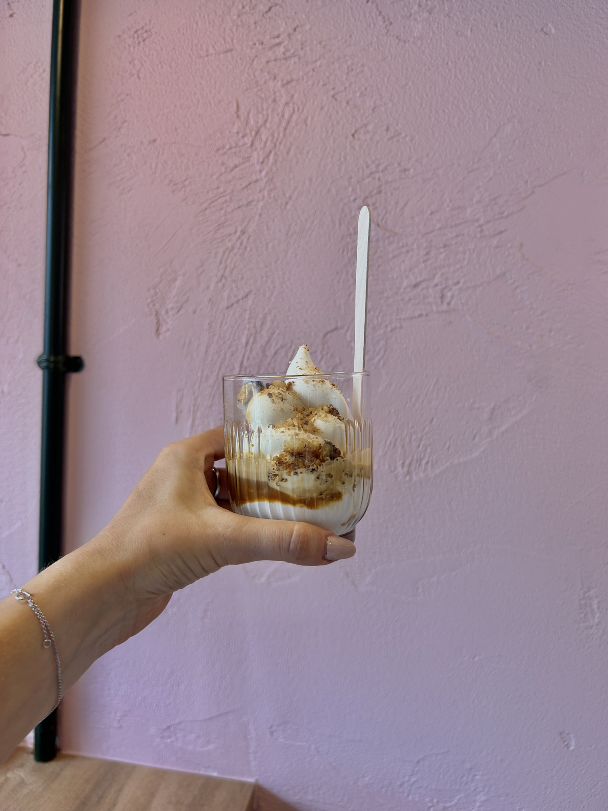 Creamy vanilla soft serve with a shot of premium grade espresso and cookie crumble.